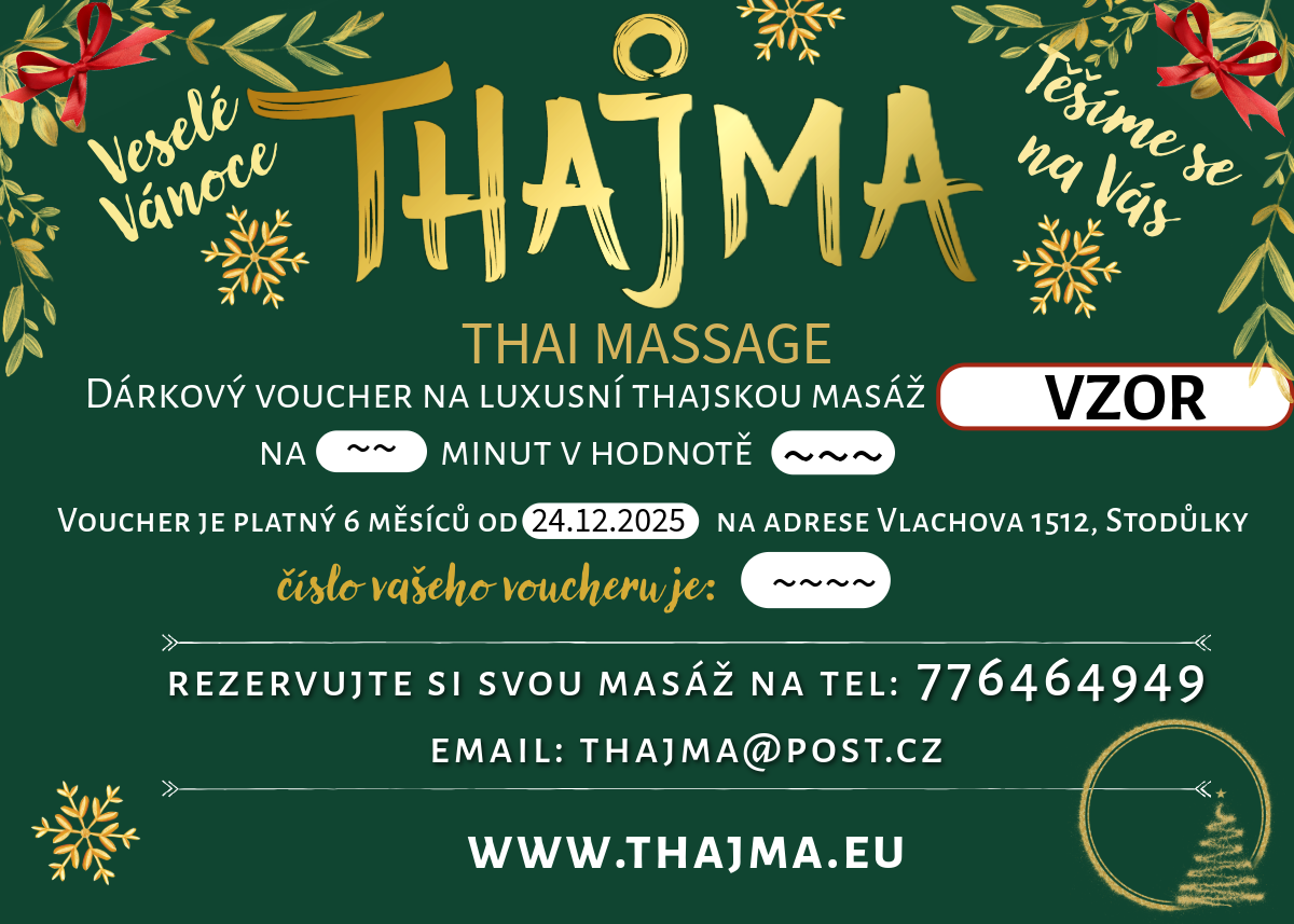 Vánoční voucher je krásný dárek pod stromeček. Můžete věnovat voucher buď na přímo zvolenou masáž, nebo v nějaké hodnotě.. Tento voucher je platný půl rok od nákupu, nebo od 24.12. 2024